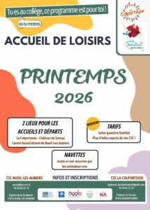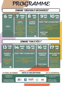 La Colporteuse et le Centre Socioculturel de Neuil-les-Aubiers, s’associe pour un accueil de loisirs en commun pour les collégiens. C’est donc 2 centres pour les indos et les inscriptions (tu choisis celui qui est le proche de chez toi) et aussi 2 lieux pour les accueils et les départs (tu viens où tu t’es inscrit). Et nous assurons les navettes pour rejoindre le lieu d’activité.