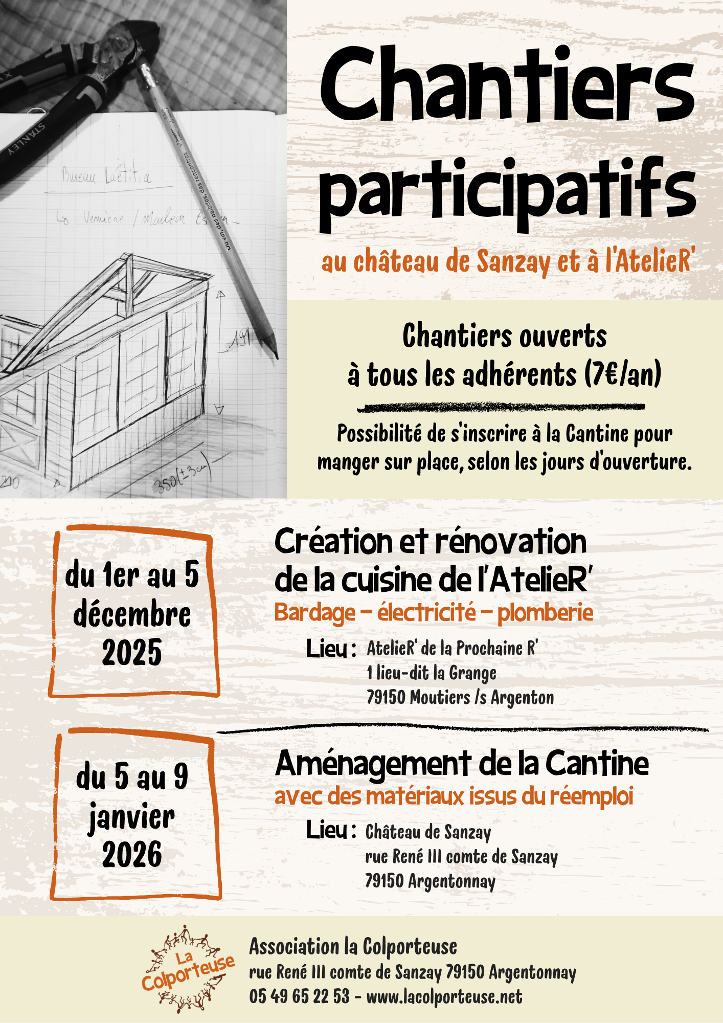 Chantiers ouverts à toutes et à tous ! Venez contribuer à la rénovation de la cuisine de l'AtelieR' à Moutiers-sous-Argenton. Une semaine de chantier pour aménager, embellir et peaufiner cet espace et rendre l'AtelieR' encore plus accueillant !